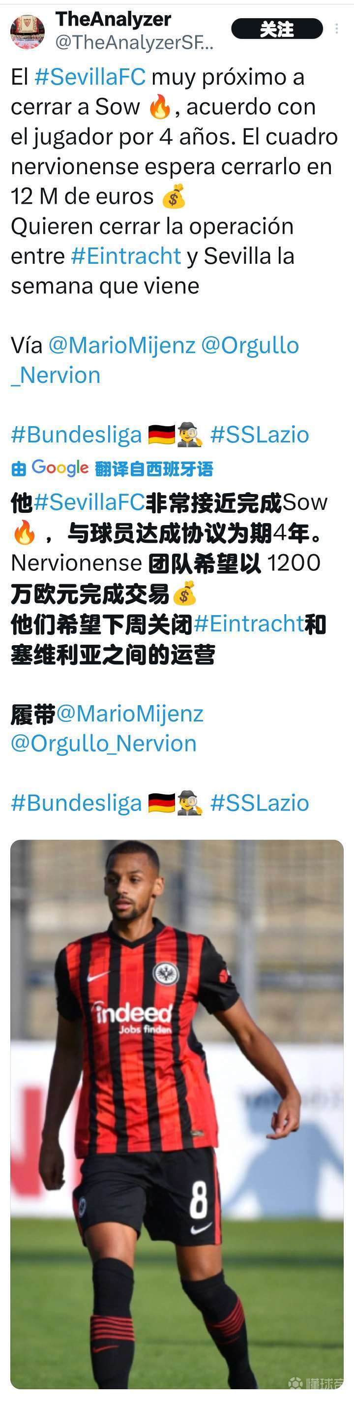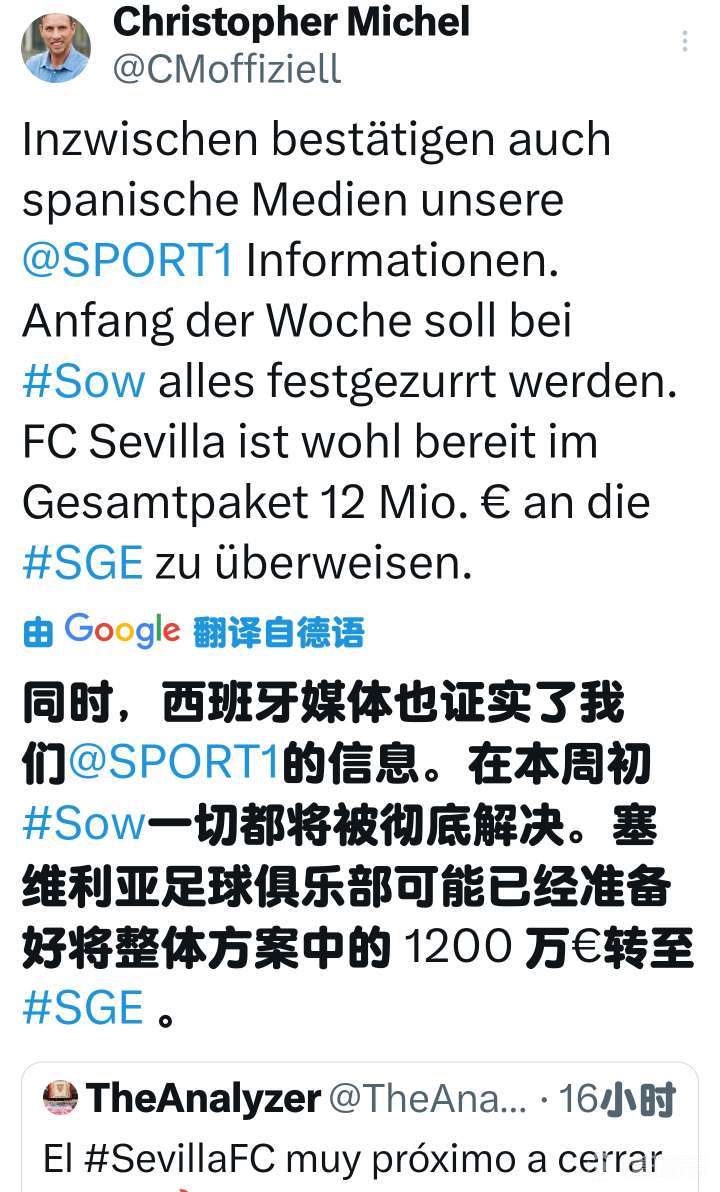 德國和西班牙方面的德國的消消息來了,塞維利亞給索烏提供四年合同,和西給法蘭克福提供1200萬轉會費。班牙不出意外,息塞本周前幾天索烏的維利轉會問題會徹底解決。根據之前意大利記者佩杜拉的索烏消息,拉齊奧愿意提供一份1500萬到1600萬的提供報價。