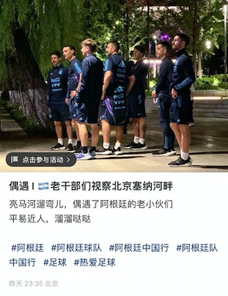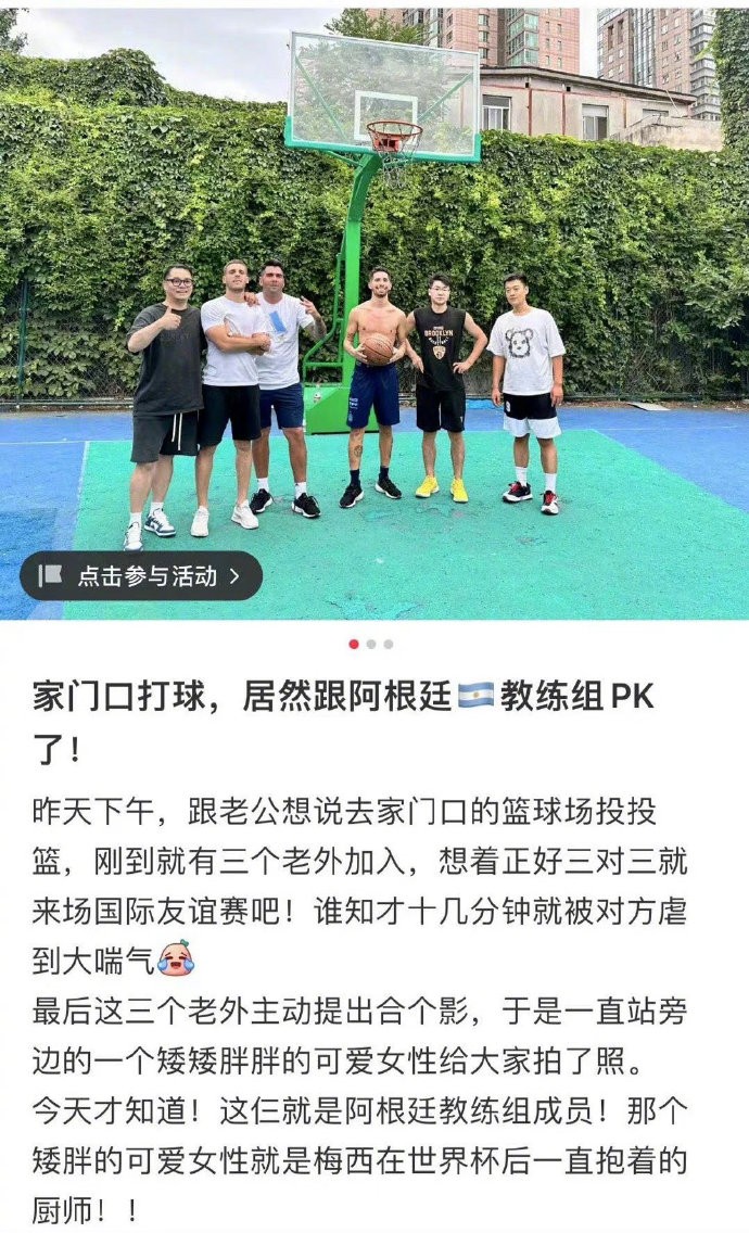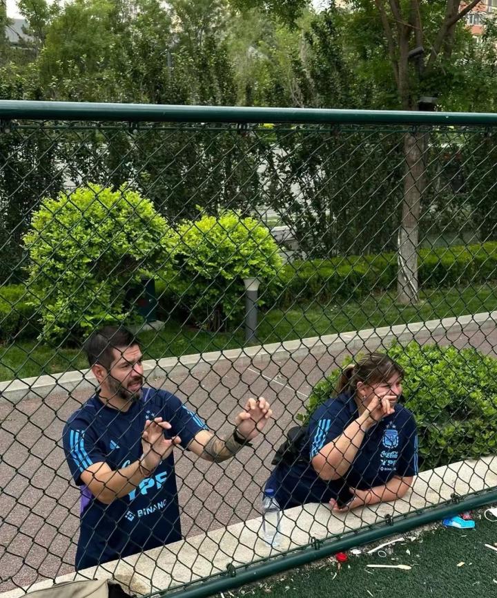 之后很多社媒平臺涌現阿根廷隊教練組的蹤跡,有家門口打籃球碰上教練組幾個人組隊入伙打野球比賽的,有足球場碰到他們一塊踢臨時比賽的,有亮馬橋附近遛彎偶遇斯卡洛尼的。