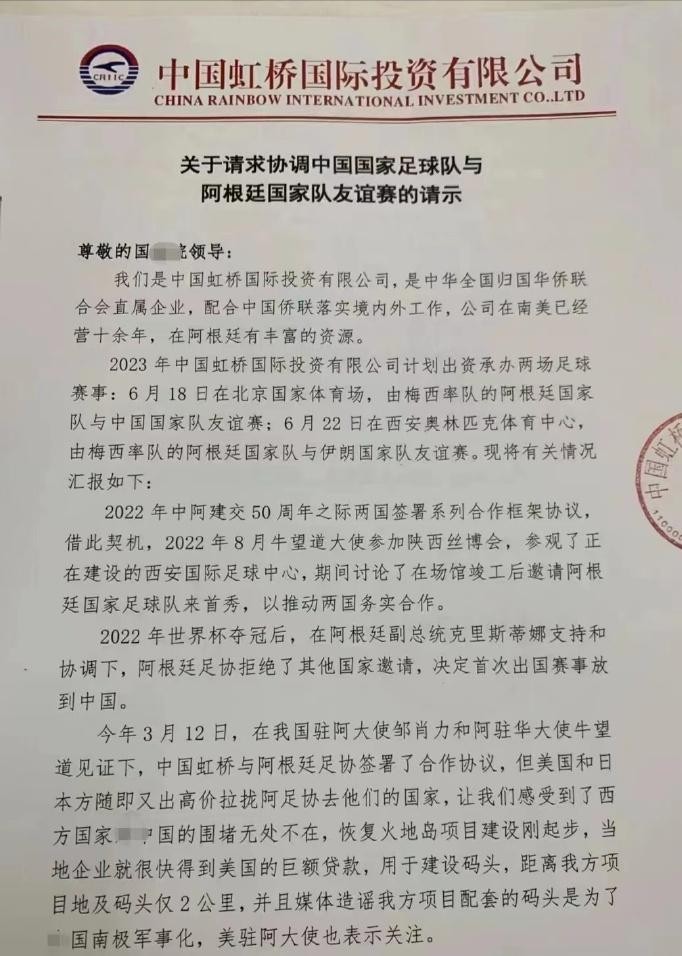 最初有傳聞阿根廷有望來華比賽后,廷華網絡上流傳出一份主辦方申請有關方面希望讓中國隊能與阿根廷隊進行比賽的申請函。