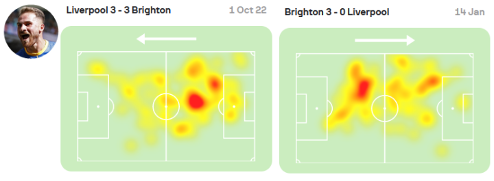 布萊頓出球時依靠平行站位的雙后腰進行傳遞,如果對手盡全力限制這兩人的轉身,麥卡利斯特會回撤到后衛線上,與格羅斯、凱塞多形成倒三角站位的中場,拉扯對手的陣型。當后衛處理球壓力較大時,麥卡利斯特會注意利用跑動空間,進行“保護性接應”。