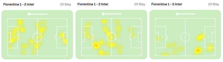 (圖)哲科、勞塔羅和戈森斯的活動熱區。小因扎吉在最后階段保留“三前鋒”配置,這是“全場防御”體系的一部分。