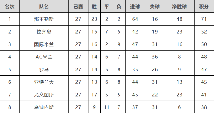 從積分榜形勢來看,截止目前,從第2名拉齊奧,到第7名羅馬,雙方的分差只有6分,意甲正在進入到一個群雄割據的時代。