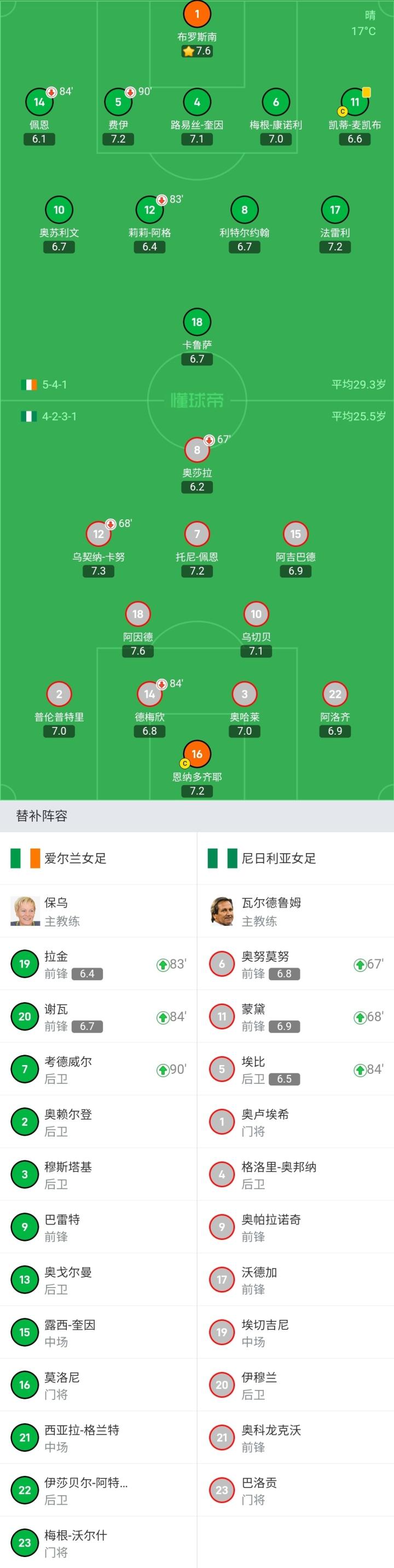 愛爾蘭女足首發:1-布羅斯南、5-費伊、4-路易斯-奎因、6-康諾利、12-阿格、10-奧蘇利文、8-利特爾約翰、11-麥凱布、14-佩恩、17-法雷利、18-卡魯薩