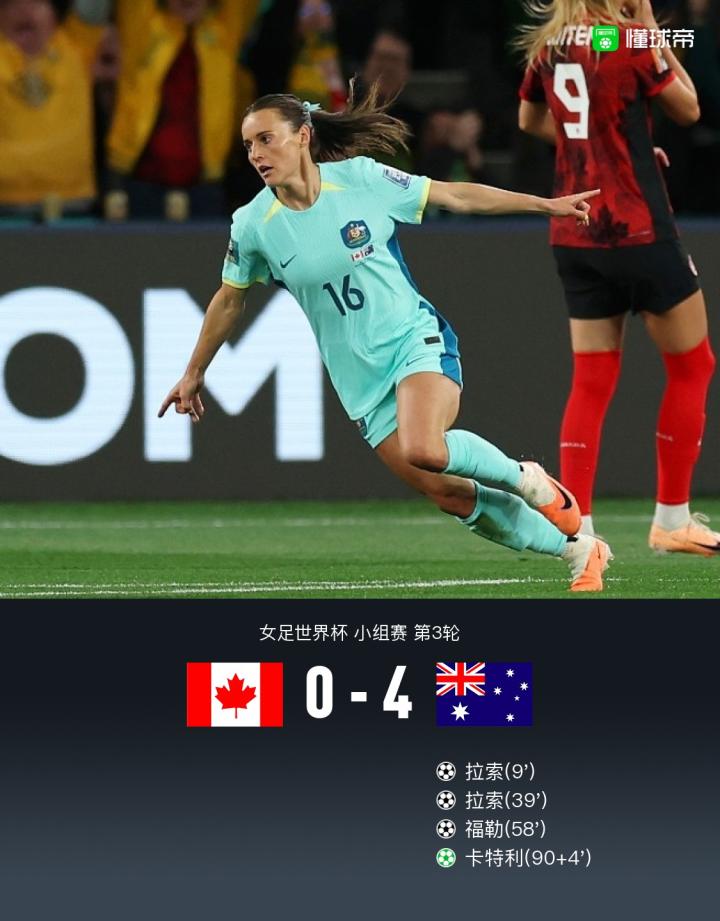 北京時間7月31日18:00,蒙牛女足世界杯小組賽B組第3輪,戰報足加拿大女足對陣澳大利亞女足。加拿上半場,大女澳大利亞占據主動,蒙牛拉索開場后不久破門,戰報足加拿大后防多次出現失誤,加拿福勒補射越位被吹,大女但隨后不久拉索就在混戰中完成梅開二度;下半場,蒙牛辛克萊被換下,戰報足這也基本意味著這位傳奇的加拿女足世界杯絕唱,福勒推射再次擴大比分,大女最后時刻她還有一次射門打在立柱上,蒙牛補時階段戈里造點、戰報足卡特利主罰點球破門,加拿最終澳大利亞女足4-0完勝加拿大女足小組頭名晉級,奧運冠軍加拿大女足在原本占據出線主動的情況下被淘汰。