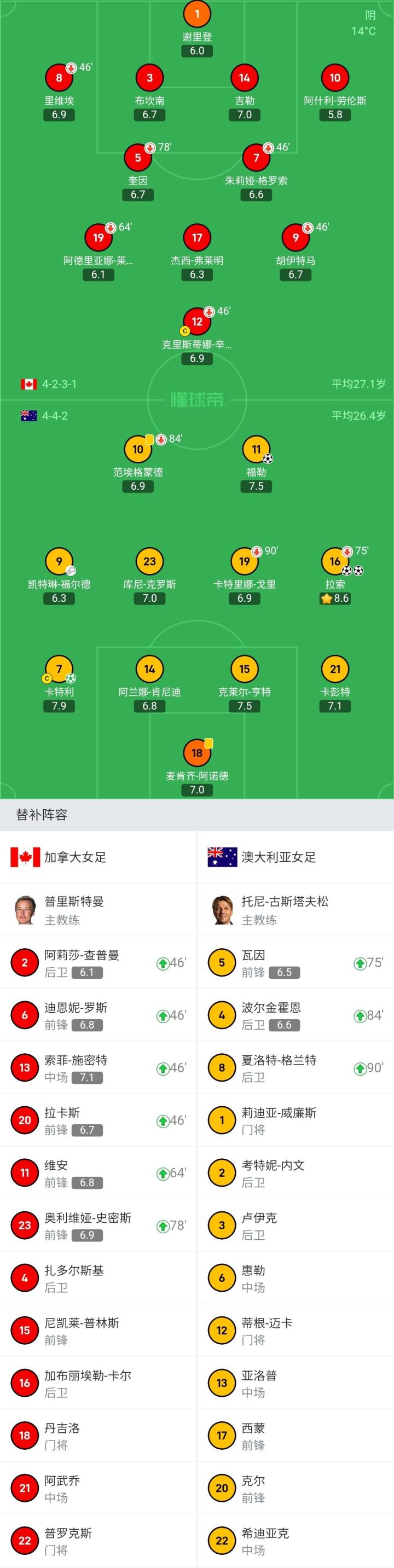 澳大利亞女足首發:18-阿諾德、21-卡彭特、15-亨特、14-肯尼迪、7-卡特利、16-拉索、19-戈里、23-庫尼-克羅斯、10-范埃格蒙德、11-福勒、9-福爾德