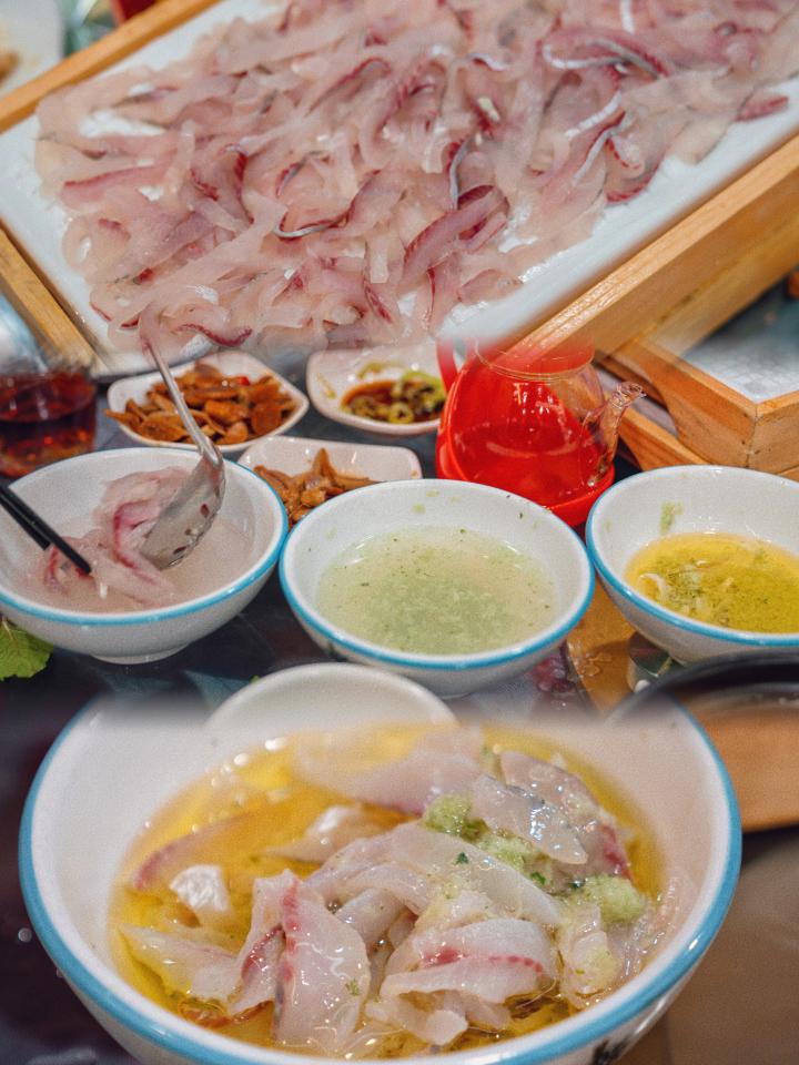 吃了足足兩份五華魚生,和順德完全不同的吃法,利用蒜蓉醋殺菌再油浸,總共三道工序,極具儀式感,竄過醋的魚生會發白微卷,經驗豐富的老饕阿敏制作出了令全桌滿意的口感。在大家的講解下,拌著薄荷葉、腌蒜、青椒絲、姜絲和花生米,一大勺下肚,那一刻其他食物都變得不重要的。我們暢談足球與生活,上海和梅州,一直喝到半夜店里空無一人才離開。