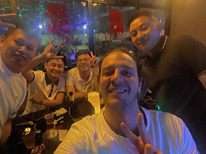 前一天晚上,老朋友Alex也抵達梅州了,約了h11爸爸去酒吧。等他安頓好孩子到的時候已經有幾位當地人作陪,據悉是看他一個老外在向吧臺詢問梅州玩樂信息,中文又好,便主動招呼一起喝酒。
