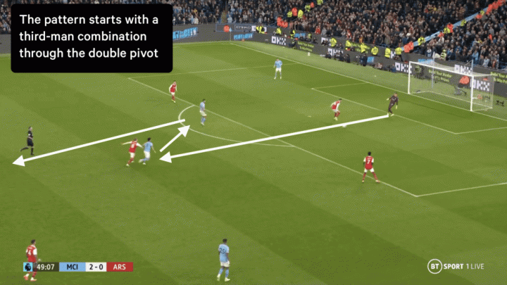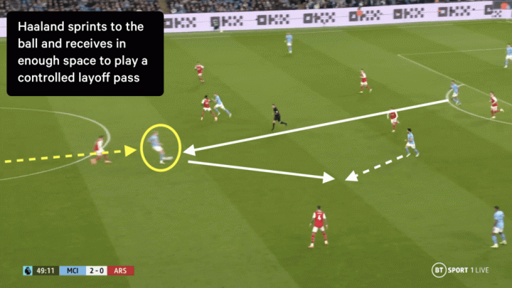 這種套路完全不同于上文我們說過的回敲+返身前插。因為這發生在更靠近本方球門的防守三區,而且哈蘭德有更大的空間得以從容得停球并做球。