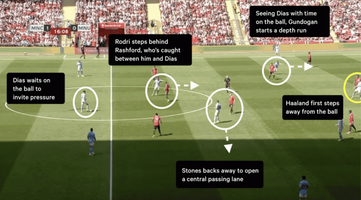 在哈蘭德開始回撤前一秒,曼城球員們都還在本能地對迪亞斯可能進行的傳球動作做出反應。