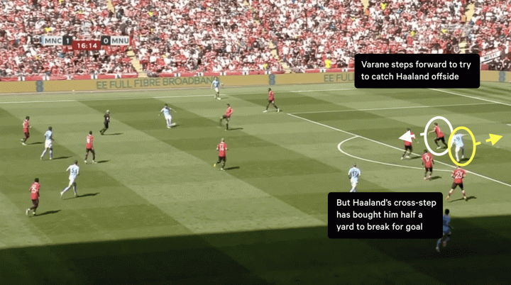 在足總杯決賽對陣曼聯的比賽中,我們看到了第三個版本的哈蘭德回撤。與上文兩種模式不同,這一模式發生在曼城進攻的最后階段,本方總后衛都推進到了中線區域,所以沒有多大的空間打對方身后了。