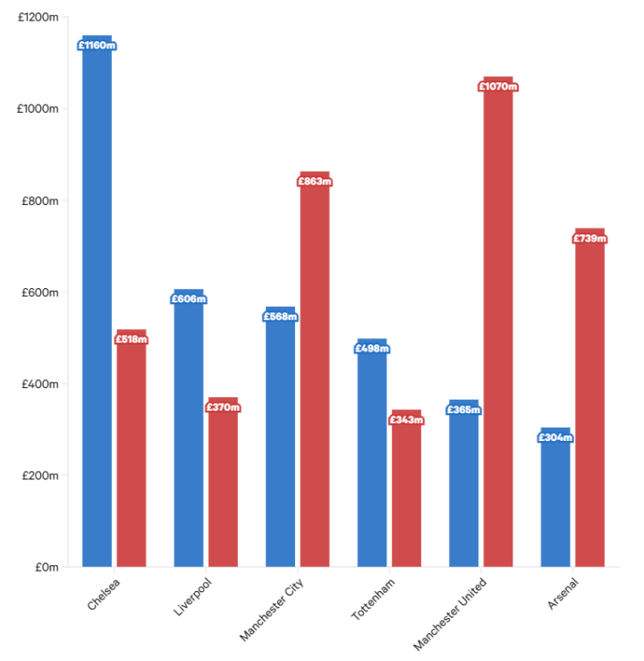 (圖)2013-14賽季以來英超“Big 6”俱樂部球員銷售額與凈支出的對比