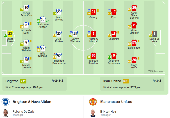 考慮到連續兩周的換人一周雙賽,滕哈格在首發進行了一定程度的但浪的懲變動,埃里克森-B費-卡塞米羅的費機罰并中場鐵三角被拆散,弗雷德取代了埃里克森的曼聯位置,上輪客串右前衛的缺席B費重新回到前腰。正印右邊鋒安東尼回歸首發。滕哈