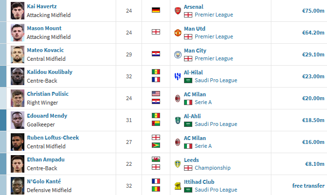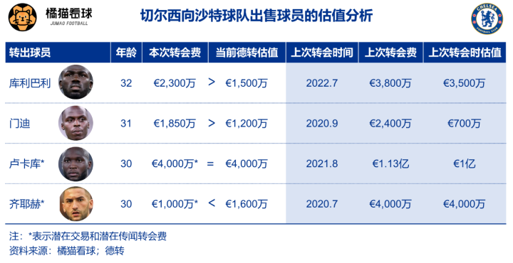 那么,切爾西向沙特球隊出售球員的價格是否公允呢?雖然業界目前尚不存在權威的球員估值體系,我們可以參照德國足球轉會網和球員的歷史轉會身價進行判斷:
